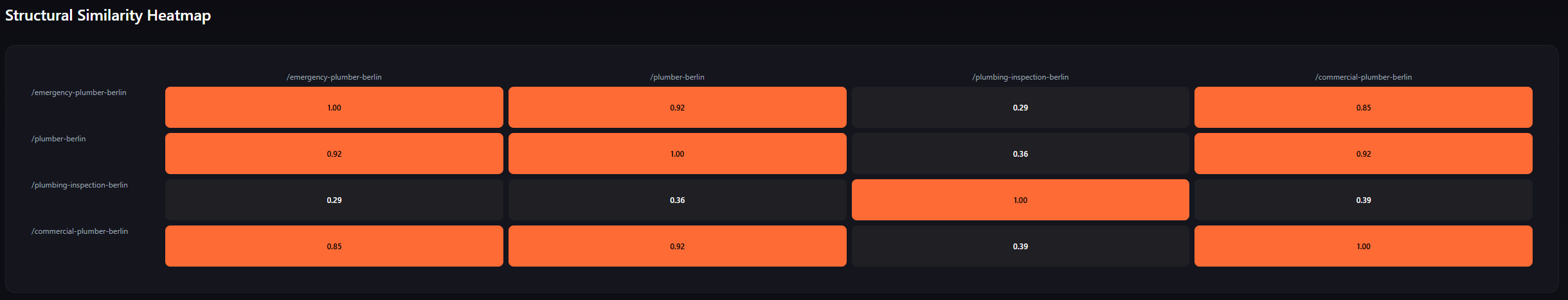 Traditional SEO tools measure keyword positions and traffic. They do not model structural semantic similarity between pages.