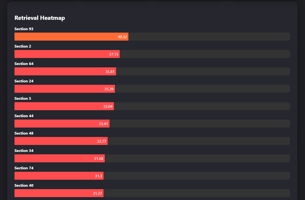 Uses Sentence Transformers, vector embeddings, and FAISS similarity search to simulate AI-style retrieval queries dynamically generated from detected entities. Computes section-level similarity dominance, retrieval strength ranking, weak block detection, and retrieval confidence heatmap. Approximates how AI systems choose which section to cite.
